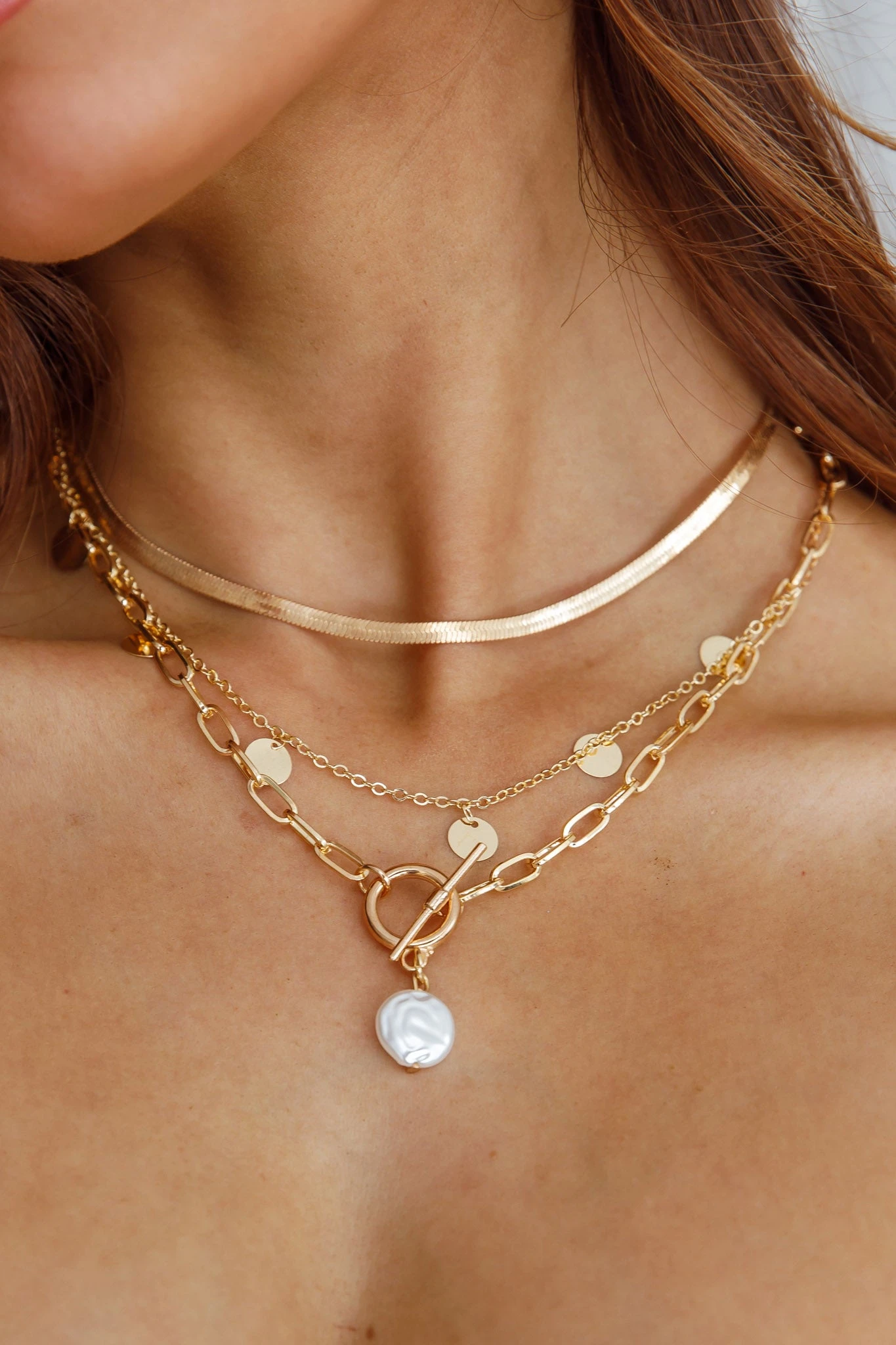 Our Marlo necklace set is just what you need to achieve the on-trend, layered necklace look. Featuring three different lengths and links and accented with a super cute, baroque, circular pearl pendant. Team it with some gold ear candy and you’ll be turning heads.
