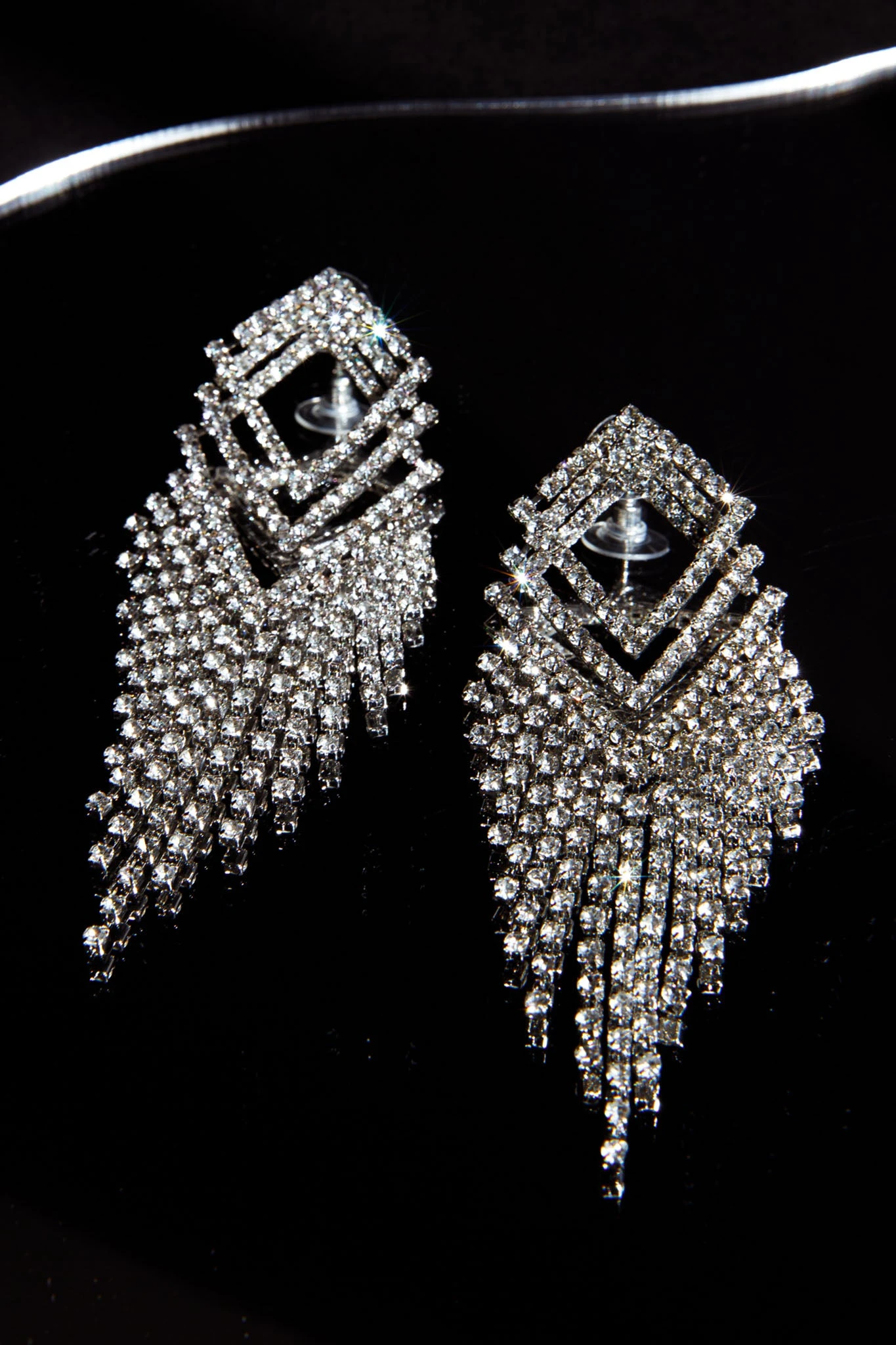 Make an entrance in our stunning Kate drop earrings. Featuring diamante-embellished, geometric kite design with a tassel drop; obsessed is an understatement! Wear them to a wedding or special occasion teamed with an elegant, satin dress and diamante clutch.