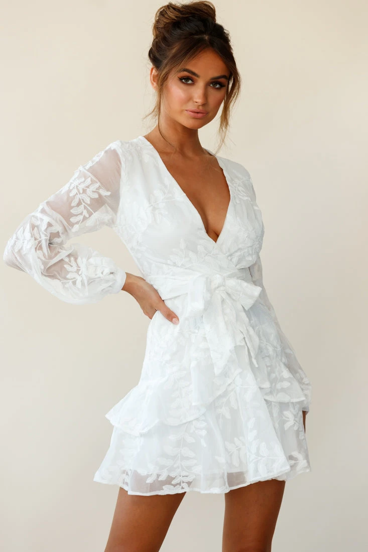 Bridal Shower? Birthday party? This pretty dress has you covered. Partially lined, with its on-trend ruffles, long balloon sleeves and flattering, faux-wrap neckline, you’ll be turning heads everywhere you go. Pair it with single strap nude heels and a clutch for a look we are loving.