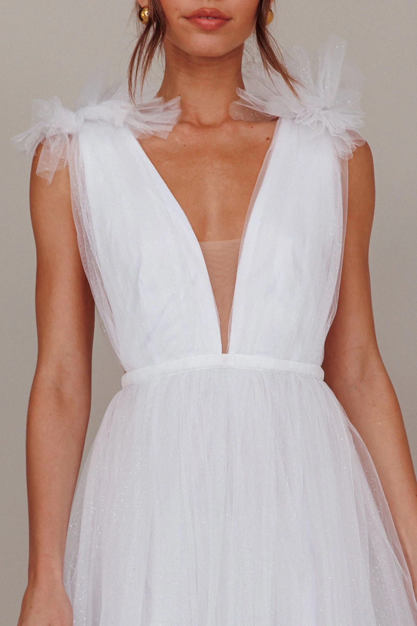 Steal the show in our gorgeous Ludivine midi dress. We are obsessed with its pretty, glitter mesh overlay and shoulder accents. Perfect for your big day down the aisle! Team it with white, strappy heels for a look we are loving.