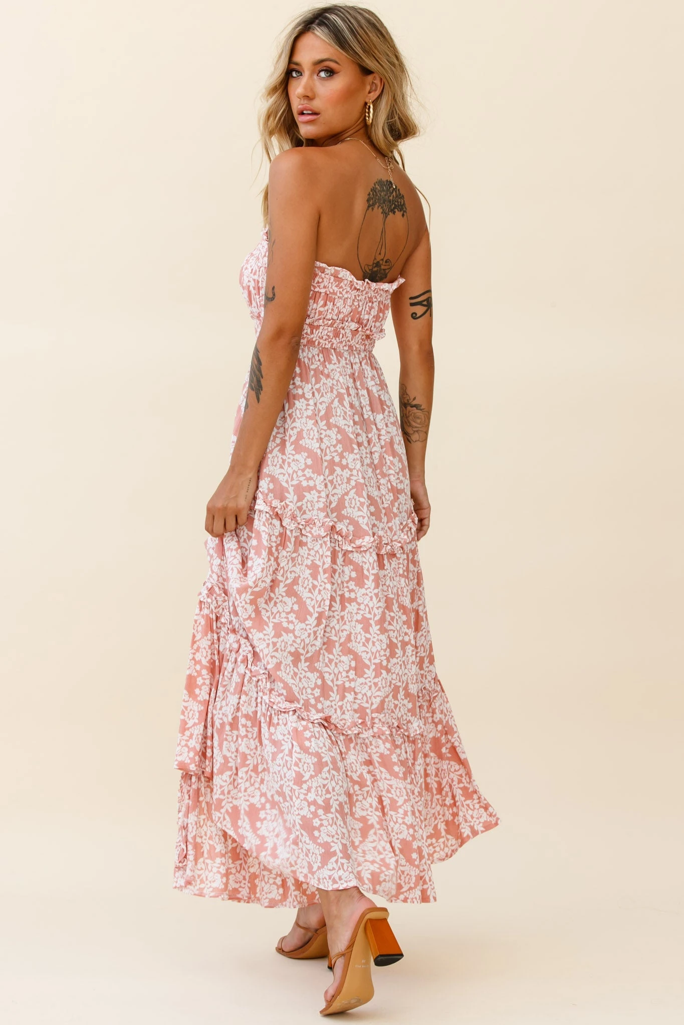 - Pink floral print dress