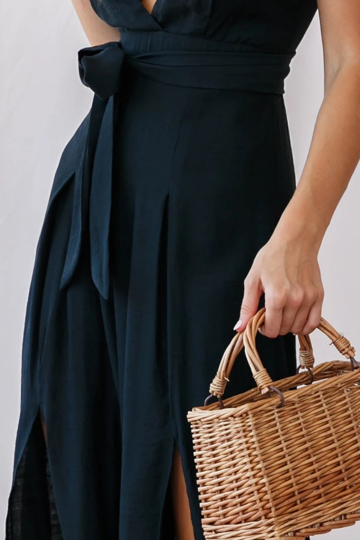 Chic and feminine, this jumpsuit is perfect for strolling the farmer’s markets or a beachside bar, it’s classy, but just the right amount of sexy with it’s V-neckline and breezy splits up the front of each leg. Partially lined, it also features a belt and invisible zipper up the back. Pair with espadrille wedges and a straw tote for a look we are loving.